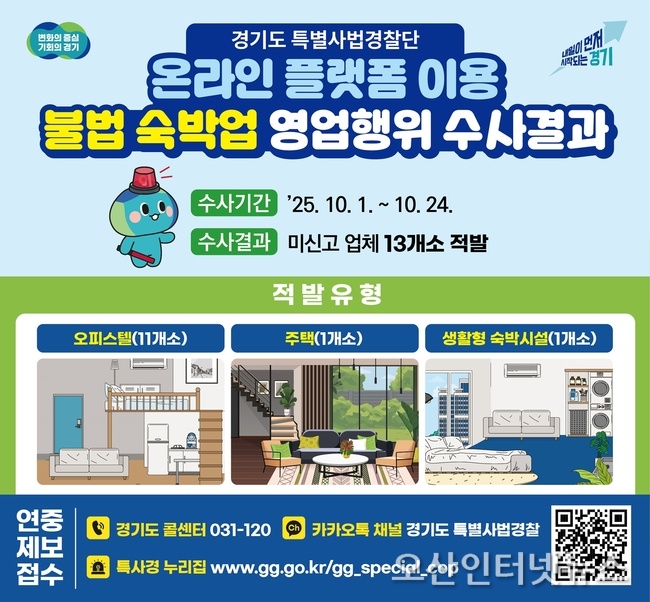 경기도 특별사법경찰단은 10월 1일부터 24일까지 고양, 부천, 성남, 화성, 안양, 김포, 용인, 파주 등 8개 지역에서 불법영업으로 의심되는 숙박업소에 대한 단속을 벌여 미신고 영업 13곳 25개 객실을 적발했다고 11일 밝혔다.