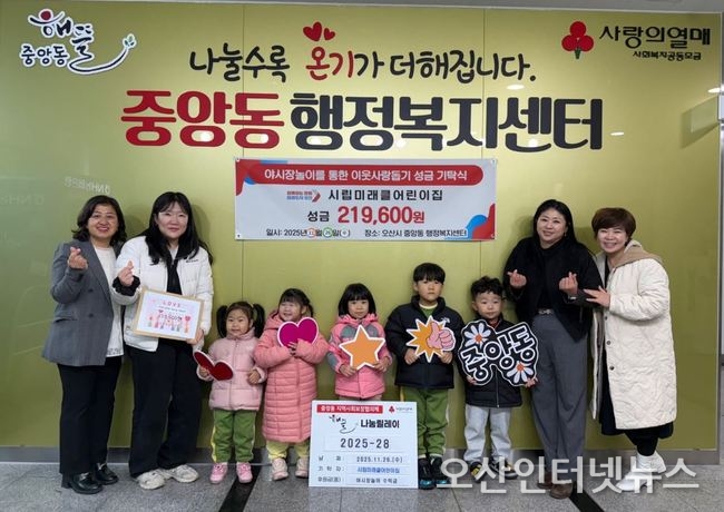 【오산인터넷뉴스】오산시 중앙동 행정복지센터는 지난 26일 오산동 소재 시립미래클어린이집(원장 김영아)에서 이웃돕기 후원금 22만 원 상당을 기부했다고 밝혔다.