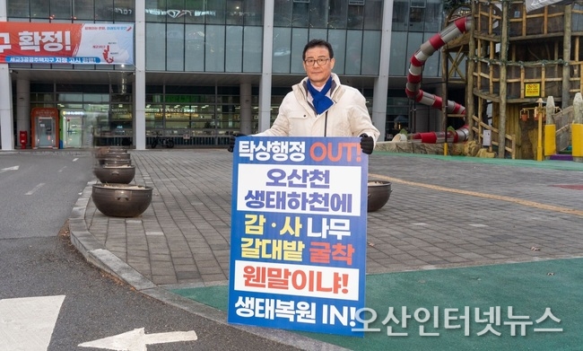 【오산인터넷뉴스】더불어민주당 6·3 지방선거 오산시장 예비후보 조재훈 (전)경기도의회 건설교통위원회 위원장이 오산시 행정 전반에 대한 문제를 제기하며 연일 1인 시위를 이어가고 있다.